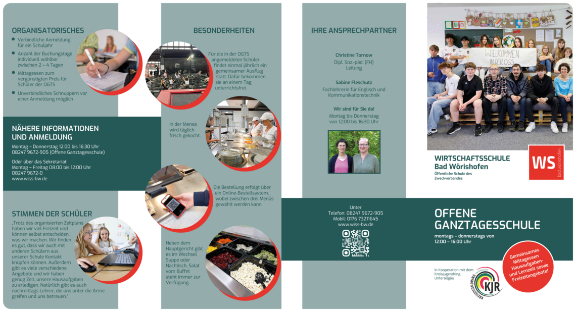 Die „Offene Ganztagesschule“ ist ein Ort, an dem die Schüler gemeinsam den Nachmittag verbringen. Unsere Zielgruppe sind alle Schüler der Wirtschaftsschule von der 5. Klasse bis zur Z10. Die Räumlichkeiten der OGTS befinden sich im Kellergeschoß der Schule, mit eigenem Jugendraum, Billardtisch, Kicker, Tischtennis und Chill-Lounge. Die Anmeldung in der OGTS ist für ein Schuljahr verbindlich. Eine Anmeldung muss für mindestens 2 Tage erfolgen.